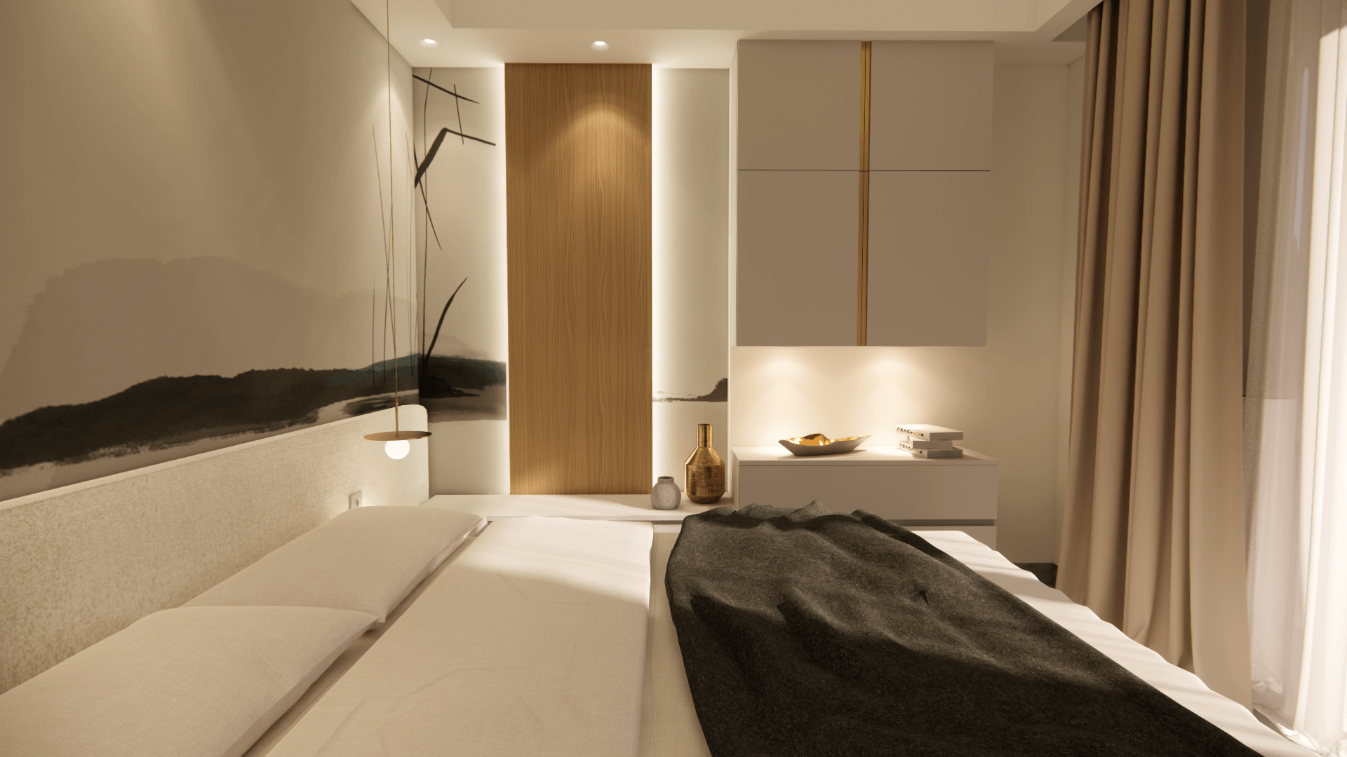 The upholstery and fabric on the headboard provide a sense of tranquility and harmony, creating a welcoming and restful space. Every detail has been thoughtfully chosen to add elegance and warmth, making the bedroom a serene retreat for relaxation.