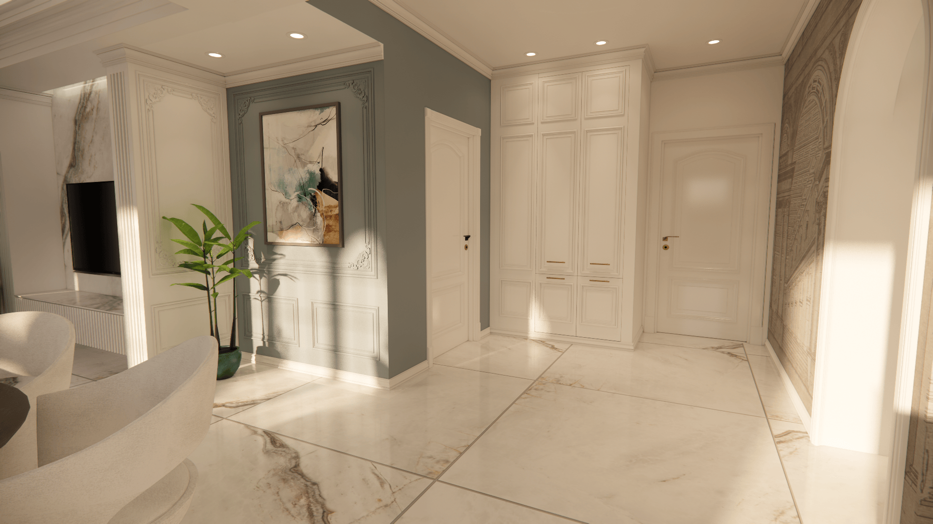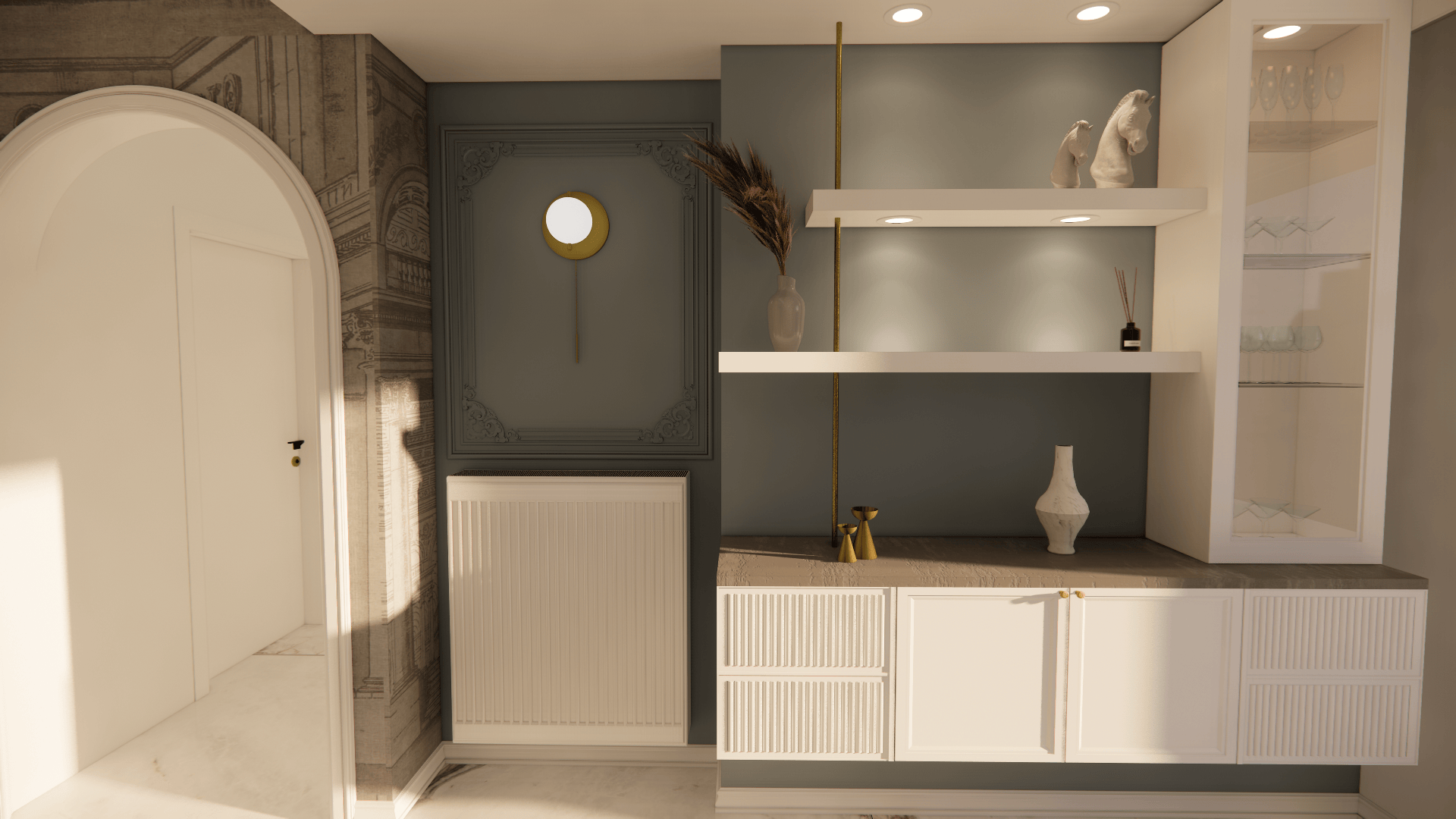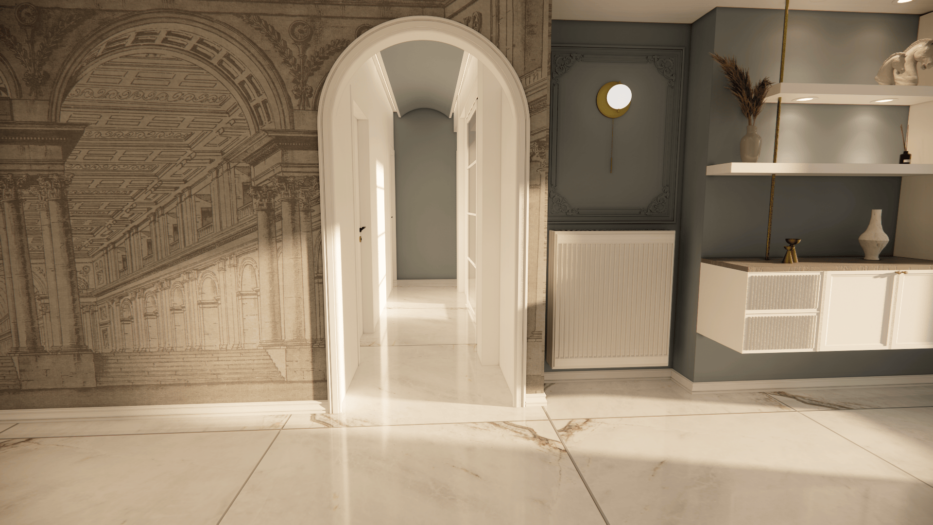 Οι μαρμάρινες επιφάνειες, σε συνδυασμό με νεοκλασικά στοιχεία και ειδικές κατασκευές επίπλων, δημιουργούν έναν φιλόξενο και αρμονικό χώρο, γεμάτο χαρακτήρα.